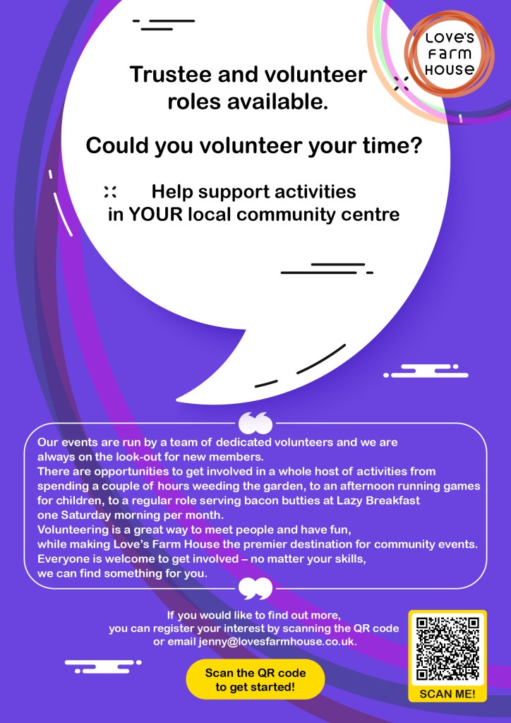 Volunteering is a great way to meet people, have fun, and help your local community along the way! There are lots of ways to get involved. If you’re interested, click here or scan the QR code above to register your details and we’ll be in touch!