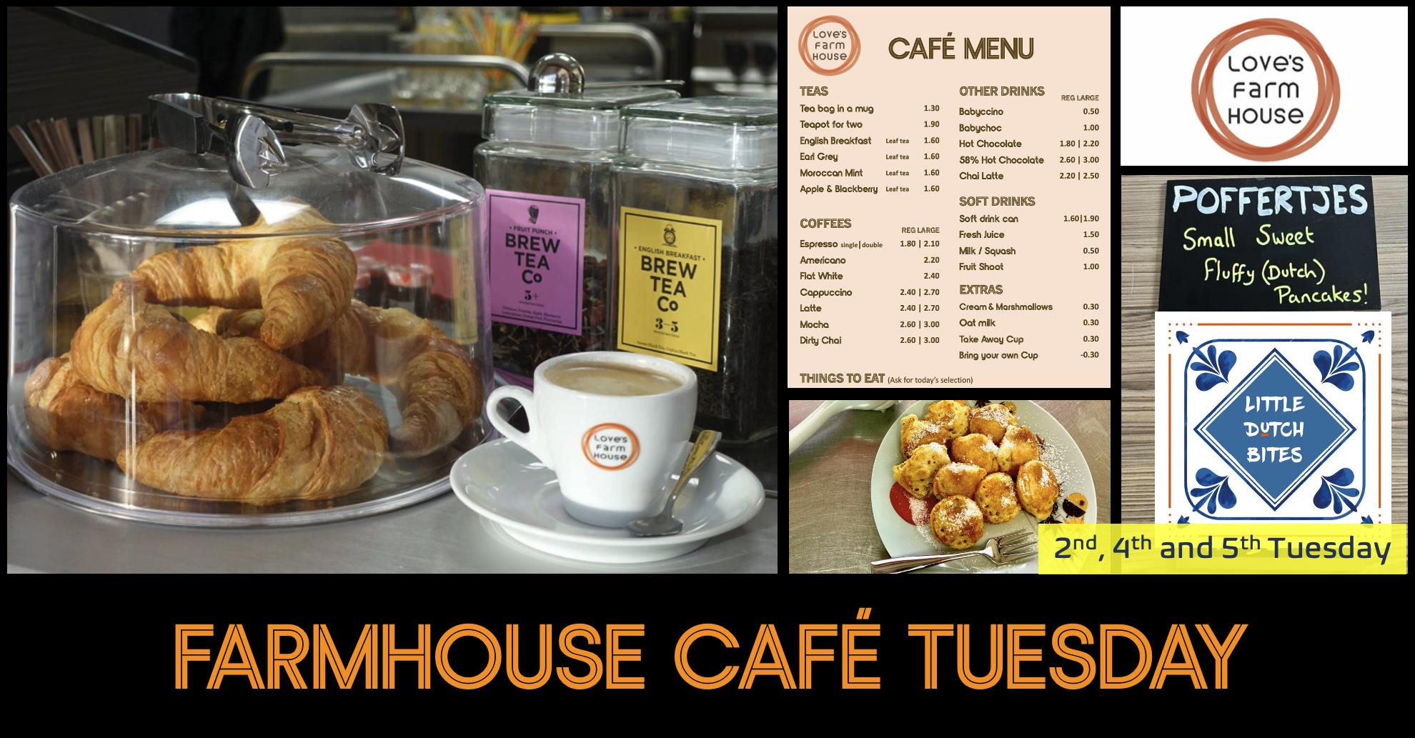 Tuesdays see the ever popular Little Dutch Bites offering their delicious Poffertjes on the 2nd, 4th and 5th Tuesdays of the month, while on Thursdays Three Sweet Treats will be selling their home baked goodies. Also on offer throughout the month are fresh from the oven pastries, which day will you join us on? Farm House Cafe Open 9am-12pm.