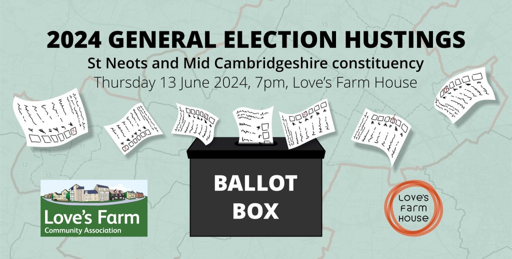 Join us at a Hustings for the upcoming general election organised by Love’s Farm Community Association, hosted by Ste Greenall of Black Cat Radio.
