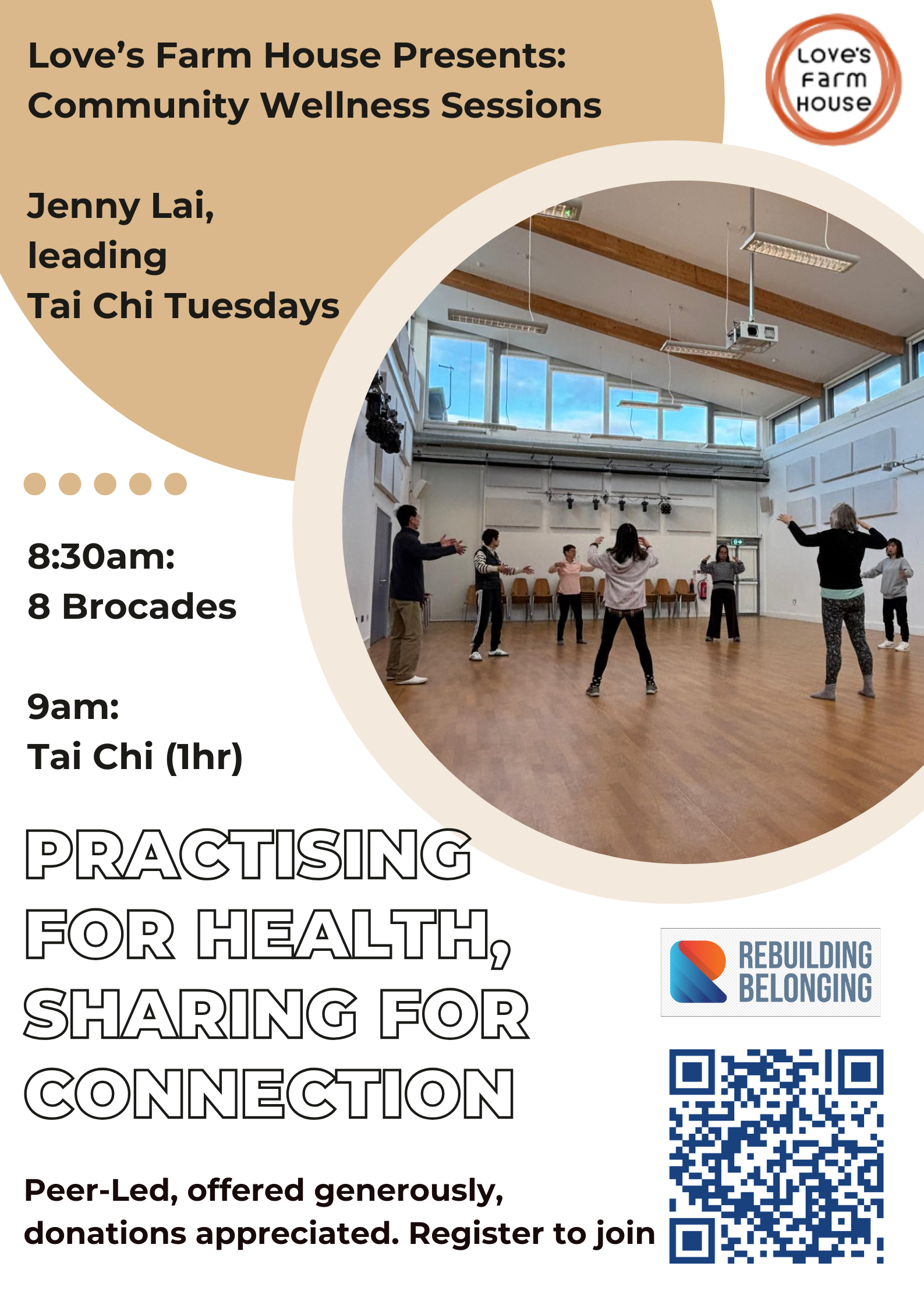 You are warmly invited to join us – free of charge – to Tai Chi Tuesdays, here at Love’s Farm House (donations welcome). Come along at 8.30am for the 8 brocades or at 9, to join in the main session.
