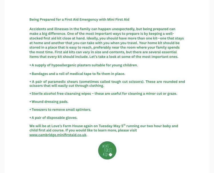 Mini First Aid will be here for a baby and child first aid class on the 5th of May, to book your place please find details at www.cambridge.minifirstaid.co.uk
