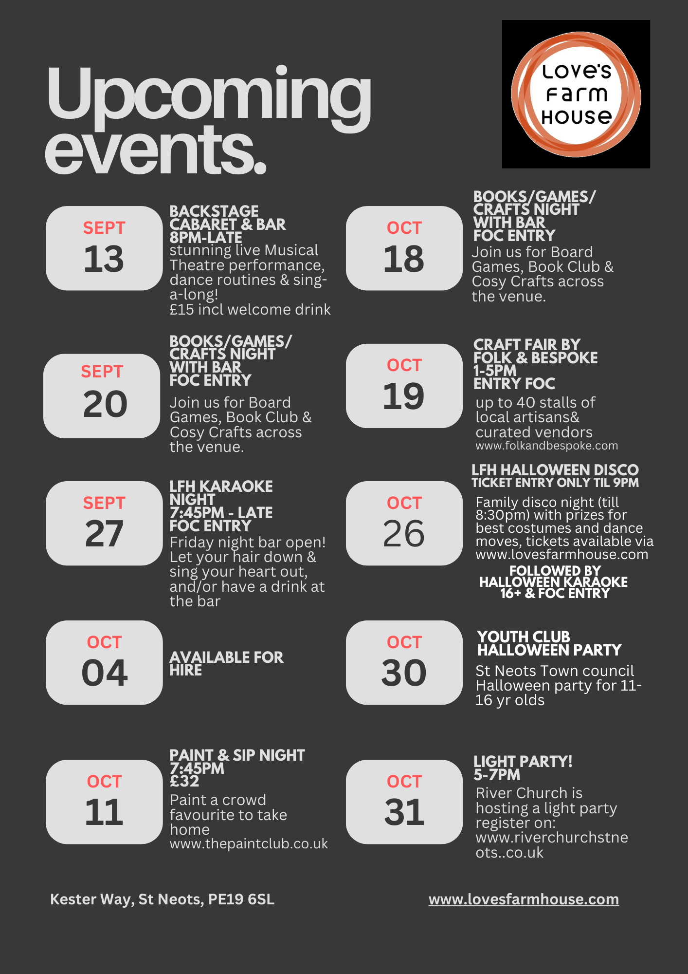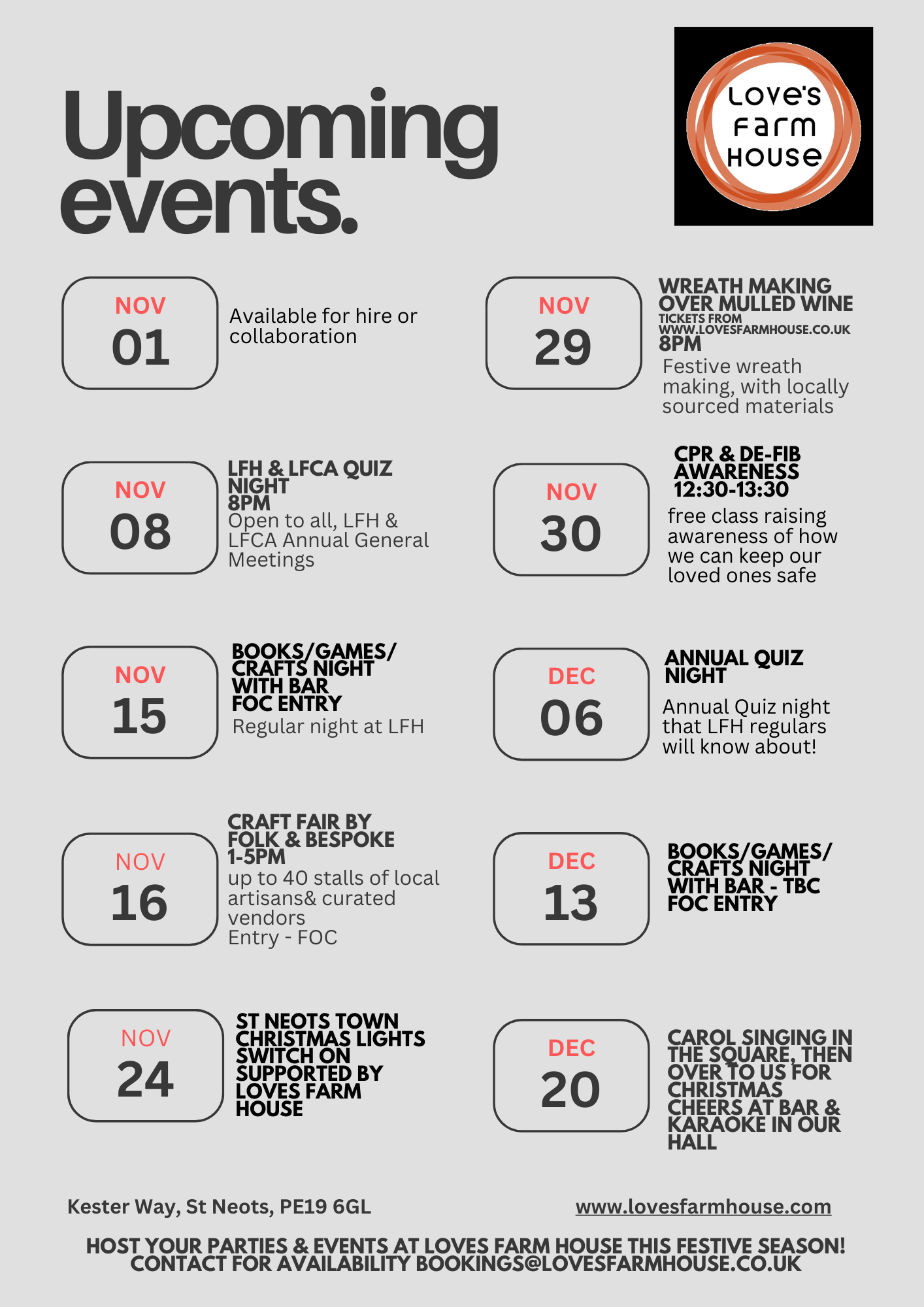 It’s the festive season! Love’s Farm House is open in the evenings and weekends & there is something for everyone! From parties and dancing to craft fairs and festive workshops, details below on times and how to join in.